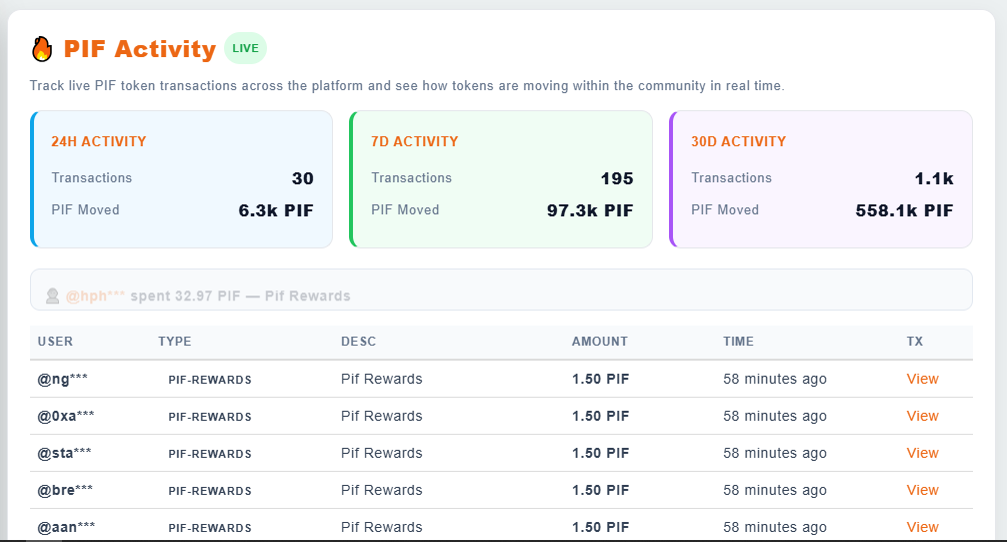Track live PIF token transactions across the platform and see how tokens are moving within the community in real time.